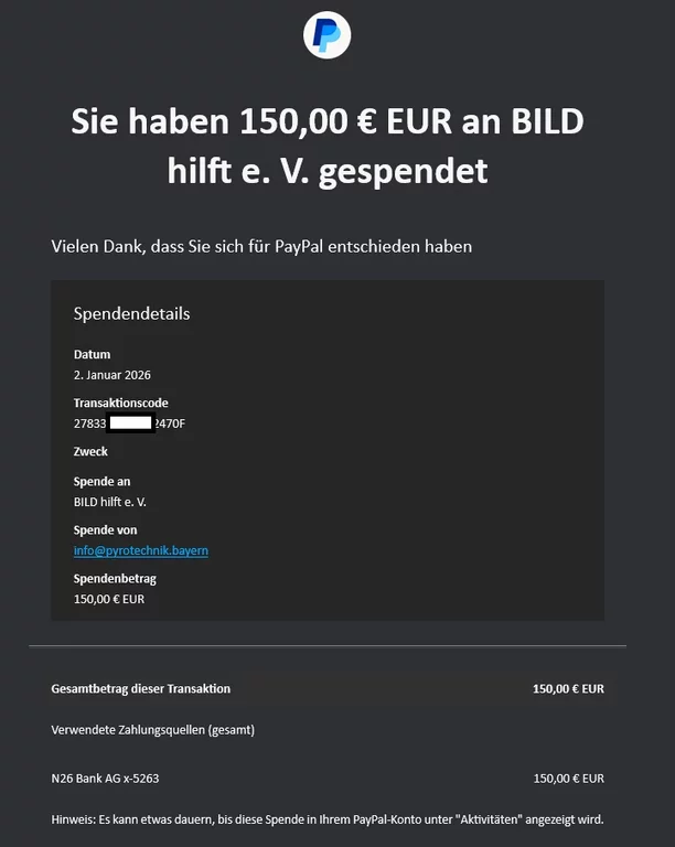 Vor Ort hatte ich angekündigt, dass ich etwa 600 € für das Feuerwerk einbehalten möchte. Kurzfristig habe ich mich jedoch entschieden, trotzdem 150 € an Ein Herz für Kinder zu spenden. Den entsprechenden Spendennachweis findet ihr weiter unten.